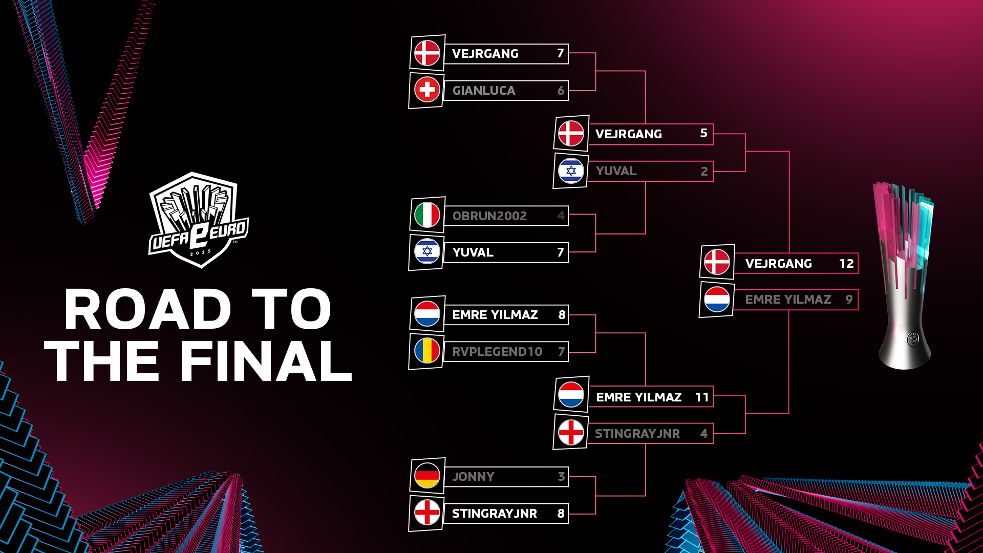 Obrun2002 (Italy), RvPLegend (Romania), Emre Yilmaz (Netherlands), Stingrayjnr (United Kingdom), Jonny (Germany), Yuval (Israel), gianluca_m17 (Switzerland) and defending champion Vejrgang (Denmark) took to the virtual pitch in a single knockout format.